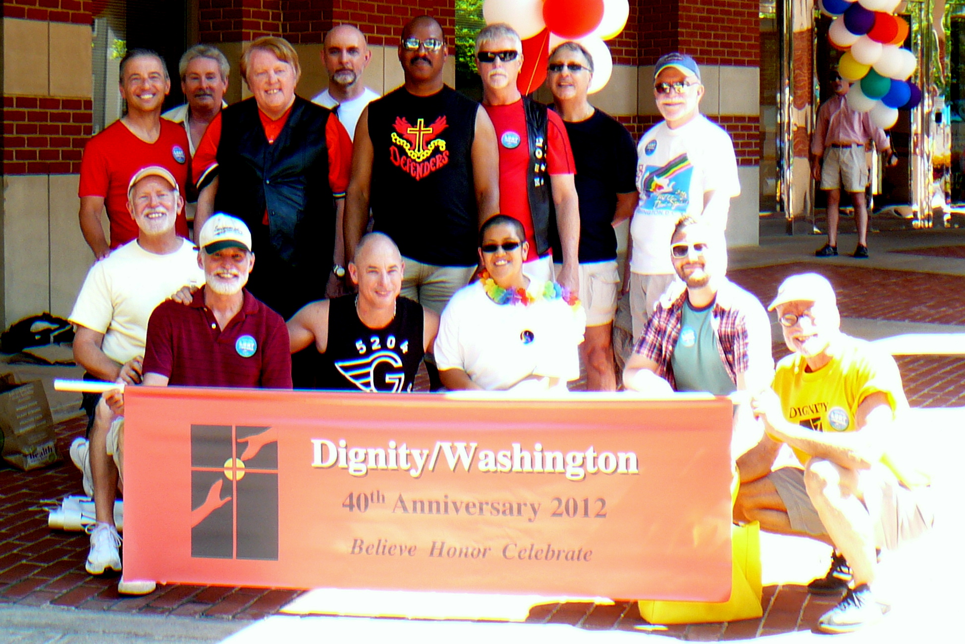Dignity/Washington members gathered on a beautiful summer day in June to celebrate Capital Pride 2012. In honor of the chapter’s 40th Anniversary, more than 40 chapter members carried a rainbow “chapel” under a an arched rainbow throughout the several-mile parade. Flagbearers carried the Defenders’ colors in the Saturday parade, and other chapter members staffed the information booth at Sunday’s Pride Festival.