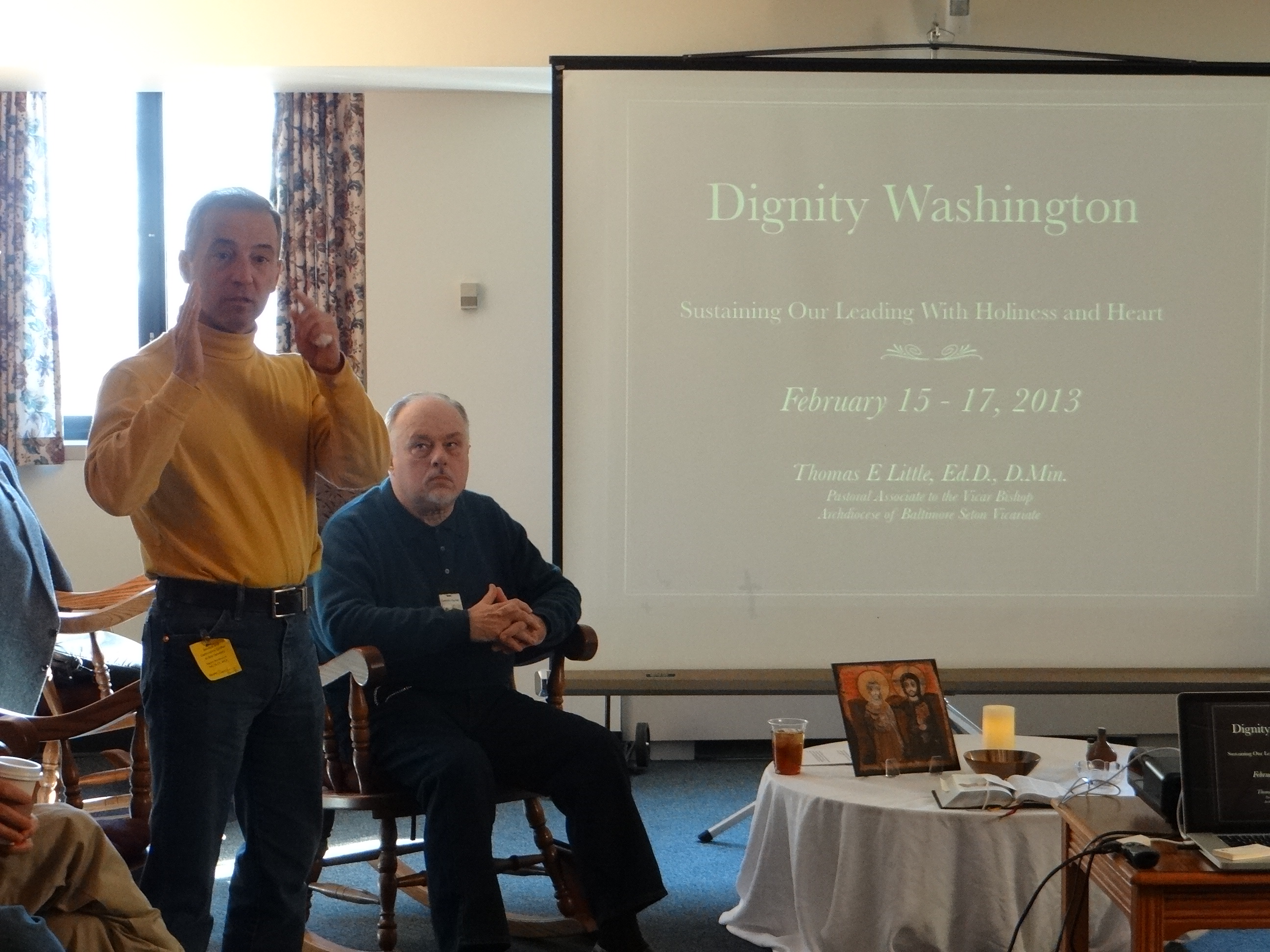 - Dan Barutta, Dignity/Washington president, addressing the retreatants during the February 15-17, 2013 Dignity/Washington Board Retreat. Dr. Tom Little, retreat/conference leader looks on.
